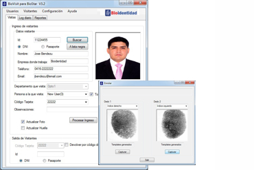 Bioidentidad ofrece una amplia variedad de software especializado para el control de visitantes, basado en tecnologías biométricas (huella dactilar,...) y de documentos de identidad (tarjetas de proximidad, smartcards, RFID,...) de alta seguridad y practicidad, para aplicaciones de control de visitas (empresas, organizaciones, residencias, clubes, etc.) y huéspedes (hotel, hostal, alojamiento, etc.).
